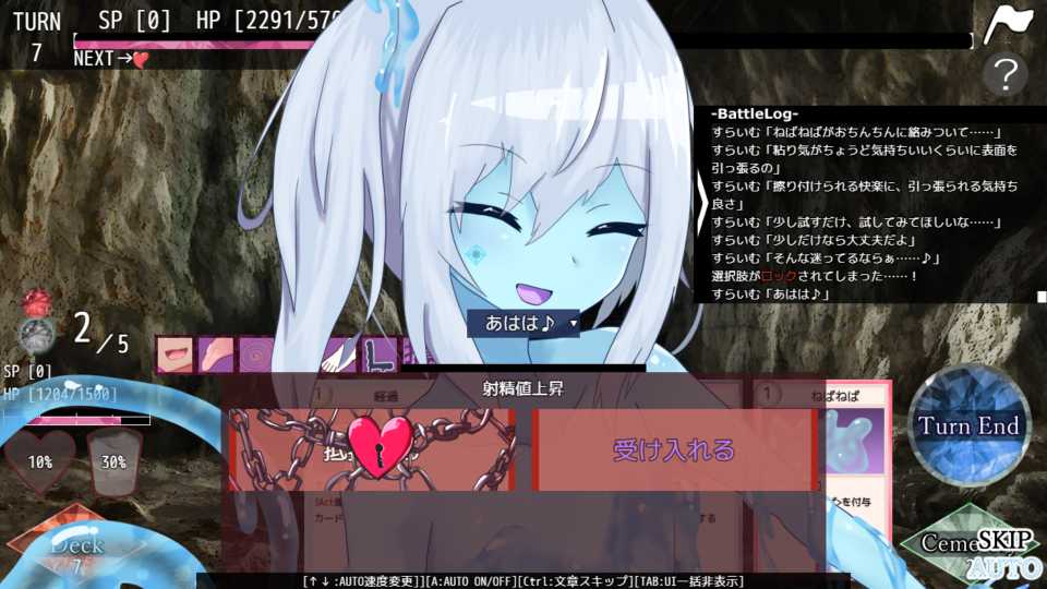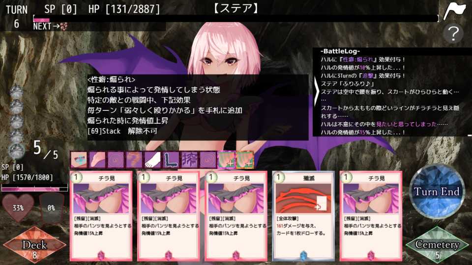 - 発情値がMAXになると数ターン何も出来ないし、射精MAXになると弱体化+ダメージなので