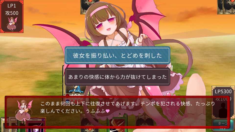- カードゲームで普通に楽しみつつ、女の子達が得意なエッチな攻撃でこちらを誘惑してきたりイかせてきたりして、最後まで飽きることなくプレイ出来ました。全体的に巨乳以上のキャラが多く、ロリはロリ巨乳が多くて結構好き。全体的にパイズリとかおっぱい誘惑に使った攻撃が多い印象かな?そして、ドMが興奮する言葉責めも多め。そういうのが好きな人にとってはかなり刺さる作品かと思いますね。キャミー戦とかメロディ戦、シャルロット戦、前編最後の戦いとか好き。対策しないとこちらが上手く動けずに、おっぱいに誘惑されおっぱいに倒されていき、煽られて行く感じとても好き。他のおっぱいさんも好きだし、足コキや手コキも良いですね。負けるのって最高や。セックスも一部キャラがしてきますが、圧倒的にパイズリ多めです。アプデや後編の製作が難しそうなのだけちょっぴり寂しいきもありますが仕方ないですね。女の子に本気で負けたい人は、引き継ぎもありますし、体験版をプレイしてみよう。回想バトルでは、敵のデッキからモンスターやカードを特殊召喚したり、手札に自由に配ったりも出来るので、自由に難易度を上げたりも出来ますね。